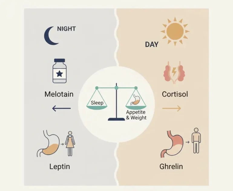 Chronically high cortisol is associated with increased appetite, cravings for high-calorie foods, and fat storage, particularly around the abdominal area. This makes cortisol one of the most important hormones linking sleep disruption and weight gain.